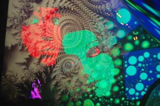 Zu dem obenstehenden Motiv erläutert er: „Das ist eine typische Aufnahmesequenz eines psychedelischen Motivs. Ein stehendes Dia original aus den 70er Jahren mit den rot / grünen Gesichtern, dazu ein um sich selbst rotierendes Muschelmotiv, auch ein Dia und eine blau grüne Ölscheibe, die sich schön verändert und bewegt. Solche Sequenzen werden auf der Electric Musicland-Party am 28.05.2011 in unterschiedlichster Form, Farbe und Bewegung gezeigt. Rotierende Prismen und manuelle Beeinflussung der Bewegung, dazu Kaleidoskope werden sanft aufeinander abgestimmt ihre Wirkung nicht verfehlen. Ich freue mich sehr auf den Abend und habe schon vieles in petto“.